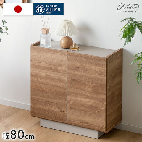 日本製 完成品 サイドボード 幅80cm キャビネット 木製 サイドチェスト 収納棚 飾り棚 リビング収納 扉付き 大容量 3段 北欧 おしゃれ 大川家具【超大型】1710009003〔シャビーオーク×グレージュ〕