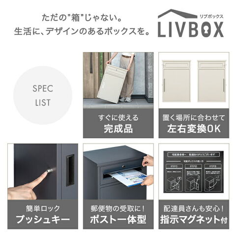 ・お手紙などの受け取りにぴったりなポスト付き ・押すだけ簡単ロック!プッシュ式 ・扉は左右変換OK ・配達員さんも安心!指示マグネット付き ただの”箱”じゃない。生活に、デザインのあるボックスを。 『LIVBOX(リブボックス)』 再配達の削減や防犯対策。宅配ボックスは、いまや暮らしの必需品です。一方で、これまでの多くの製品は、見た目や使い心地まで考えられていない“ただの箱”でした。 「Living(生活)」×「Box」。タンスのゲンの 『LIVBOX(リブボックス)』 は、玄関に置くことを前提に、見た目と使いやすさの両方にこだわって開発された宅配ボックスシリーズです。 「置いてよかった」と思える存在を目指して。無機質になりがちな宅配ボックスを、暮らしに自然となじむデザインへ。LIVBOX(リブボックス)シリーズなら、あなたの住まいに合う一台が、きっと見つかります。 |
