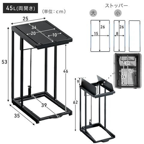 30L(縦開き):幅17×奥行39×高さ53cm 45L(縦開き):幅25×奥行39×高さ53cm 45L(両開き):幅25×奥行39×高さ53cm |