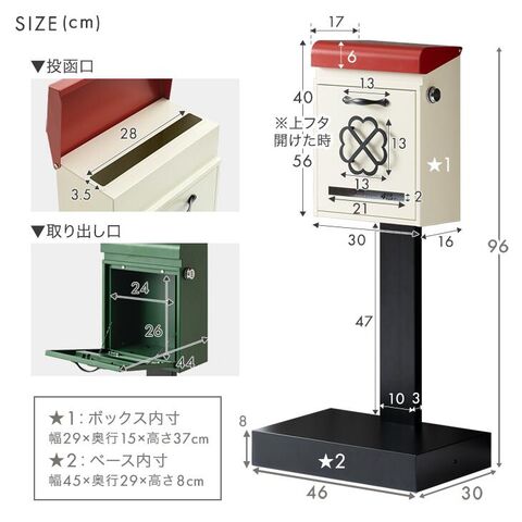 ・おしゃれなカントリー調ポスト └陰影映える花型アイアンプレート ・設置らくらく置き型ポスト ・重りを入れて盗難対策!ウエイトベース ・安心セキュリティ ダイヤル錠 ・中が確認できるスリット窓 ・荷物を守る上蓋&雨ガード ・長く使える防サビ仕様 |