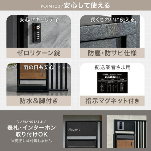 設置らくらく門柱ポスト一体型宅配ボックス ・おしゃれな格子デザイン ・表札/インターフォン取り付けOK ※商品には付属しません ・重りを入れて盗難対策!ウエイトベース ・たっぷり入る 大容量101L ・玄関からの取り出しがスムーズな 背面扉 ・お手紙などの受け取りにぴったりなポスト付き ・中が確認できるスリット窓 ・安心セキュリティ ゼロリターンキー ・長く使える防塵・防サビ仕様 ・雨の日でも安心!防水&脚付き ・配達員さんも安心!指示マグネット付き ただの”箱”じゃない。生活に、デザインのあるボックスを。 『LIVBOX(リブボックス)』 再配達の削減や防犯対策。宅配ボックスは、いまや暮らしの必需品です。一方で、これまでの多くの製品は、見た目や使い心地まで考えられていない“ただの箱”でした。 「Living(生活)」×「Box」。タンスのゲンの 『LIVBOX(リブボックス)』 は、玄関に置くことを前提に、見た目と使いやすさの両方にこだわって開発された宅配ボックスシリーズです。 「置いてよかった」と思える存在を目指して。無機質になりがちな宅配ボックスを、暮らしに自然となじむデザインへ。LIVBOX(リブボックス)シリーズなら、あなたの住まいに合う一台が、きっと見つかります。 |