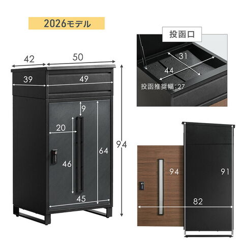 | 付属品 | 印鑑ボックス(マグネット)、エマージェンシーキー×2、固定アンカーボルト(4本) 固定ワイヤー(2本)、宅配業者様向け指示マグネット、クッションマット(1枚)、ステッカー(2026モデルのみ) |