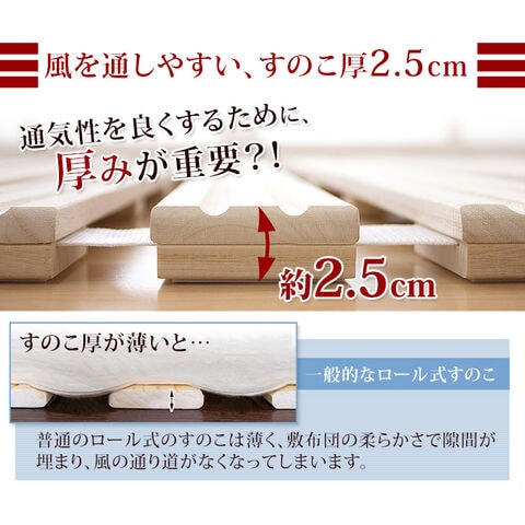 | 【シングル】幅100×奥行き200×高さ2.5cm 【セミダブル】幅120×奥行き200×高さ2.5cm 【ダブル】幅140×奥行き200×高さ2.5cm 【クイーン】幅160×奥行き200×高さ2.5cm すのこ厚:2.5cm(1.2+1.3cm) すのこ幅:7cm すのこ間隔:3.4cm |