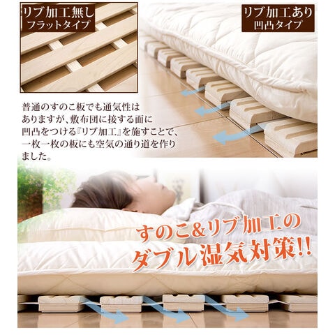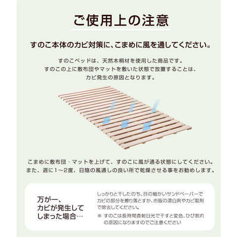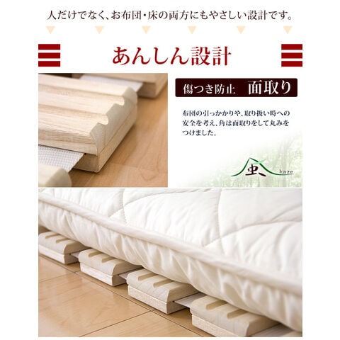 | ※すのこの上に立つ場合はさん木の上に足をかけるなど強度の弱い部分に体重がかからないようにご注意ください。 ※飛び跳ねたり、一点に荷重をかけたりすると割れる恐れがあります。 ※固綿入りの厚手の敷布団や、マットレスでの使用を奨励しています。 ※1カ所に力が加わるようなご使用で破損した場合、取扱い説明書の注意をお守り頂いていない場合などは、返品・交換の対象外となりますので、予めご了承ください。 |