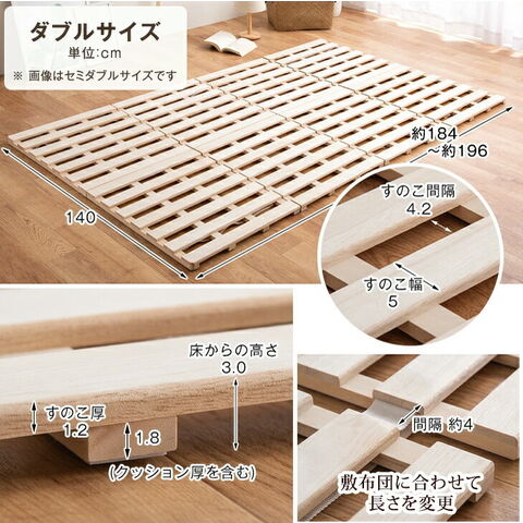 | 外寸:幅140×長さ184~196×高さ3.0cm (ダブルサイズ) すのこ厚:1.2cm すのこ幅:5cm すのこ間隔:4.2cm |