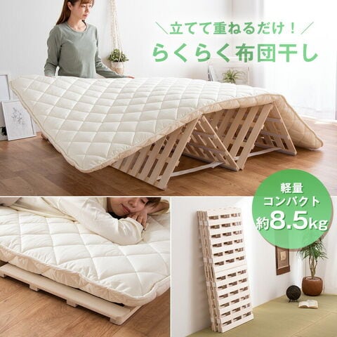 | ※すのこの上に立つ場合はさん木の上に足をかけるなど強度の弱い部分に体重がかからないようにご注意ください。 ※飛び跳ねたり、一点に荷重をかけたりすると割れる恐れがあります。 ※固綿入りの厚手の敷布団や、マットレスでの使用を奨励しています。 ※1カ所に力が加わるようなご使用で破損した場合、取扱い説明書の注意をお守り頂いていない場合などは、返品・交換の対象外となりますので、予めご了承ください。 ※敷いたまま無理に引きずると床に傷がつく恐れがありますので、ご注意ください。 |