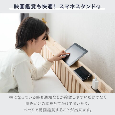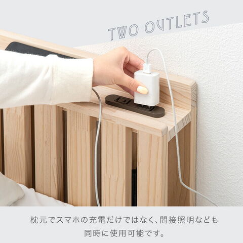 | ・見た目が美しいパイン材使用 ・寝ている間も枕元でスマホの充電が可能なコンセント2口付き ・コンセントはほこりが入りにくくより安全なスライド式 ・雑誌などを収納できるブックシェルフ付き ・角丸でケガ防止 |