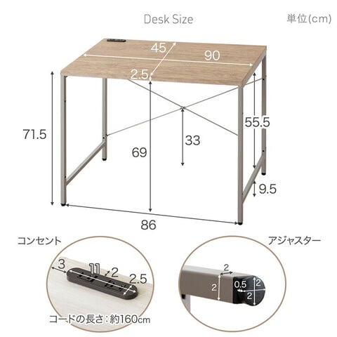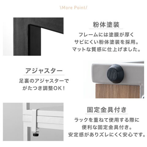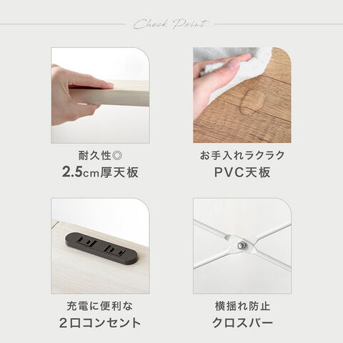 ・耐久性に優れた2.5cm厚天板 └キズや汚れに強いPVC ・温もりのある木目調orモダンな石目調 ・便利な2口コンセント付き ・横揺れを防止するクロスバー ・マットな質感の粉体塗装 |