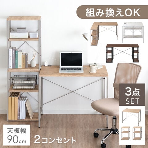 組み換えOK ラック付き デスク 3点セット 幅90 コンセント付き 机 PCデスク サイドラック L字 コンパクト 本棚 収納付き 在宅 おしゃれ 99900540〔シャビーナチュラル×グレージュ〕【予約】1月下旬※1/31までに出荷予定