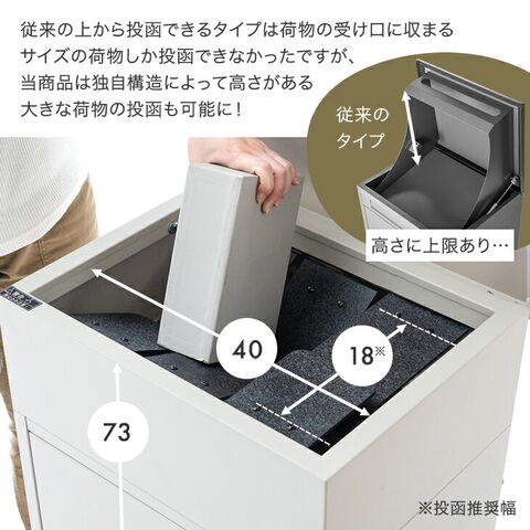 新開発!上から押し込み式宅配ボックス └大きい荷物を何度も投函OK └上からは取り出しにくい独自設計で盗難対策に! ・大容量105L ・土台におもりを入れて簡単に転倒・盗難対策OK ・配達員さんも安心!指示マグネット付き |