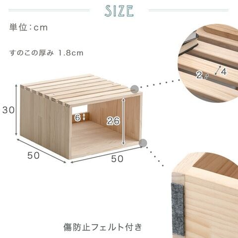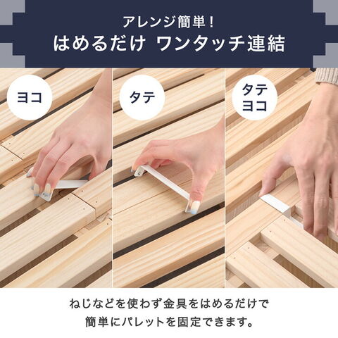 | 備考 | 【完成品】 ※配送は全て宅配便(1人)での玄関渡しとなります。大型商品や重量商品、エレベーターの無い2階以上にお住まいのお客様は、玄関口までの搬入をお手伝いをお願いしております事をご了承ください。 ※破損の原因となりますので、すのこの上に直接乗るのはおやめください。 ※一点に力を加わるご使用は避けてください ※本ページは【収納パレット2枚のみ】の販売ページです。当店のパレットベッド(99900140)の拡張やアレンジ用にお買い求めください。 ※2025年8月26日より、補強バーのサイズが【1.8×1.8cm】から【1.8×2.5cm】へ変更となりました。 これに伴い、タテヨコ連結金具のサイズも変更されており、旧仕様との互換性はございません。追加で購入される際はご注意ください。 |