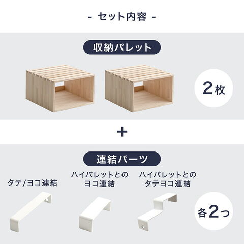 ・ベッド下をこだわりの空間にする収納パレット ・収納パレット2枚セット ・ワンタッチで簡単連結金具付き ・ぬくもり感じる天然木パイン |