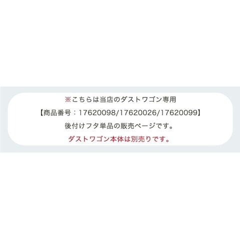| 備考 | 【組立品】 ※配送は全て宅配便(1人)での玄関渡しとなります。大型商品や重量商品、エレベーターの無い2階以上にお住まいのお客様は、玄関口までの搬入のお手伝いをお願いしております事をご了承ください。 ※生産工程上、パーツによって色味が異なる場合がございます。 ※こちらは当店の「ダストワゴン」専用 フタ販売ページです。 |