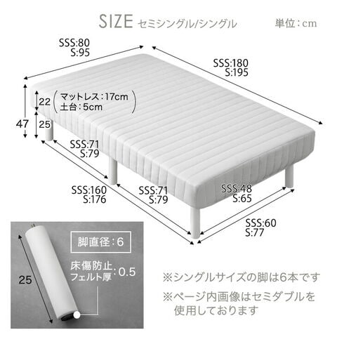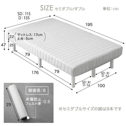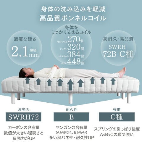 | 【組立品】 ※配送は全て宅配便での玄関渡しとなります。 ※マットレスは約1~2日で復元します。気温や温度により3~14日かかる場合もあります。 ※こちらの商品は、2022年12月8日より、ナチュラル脚からマットレスと同色のワントーンデザインに、カバーを取り外ししやすいボックスシーツ型に変更、フレームが木製→スチールに仕様変更しました。 |