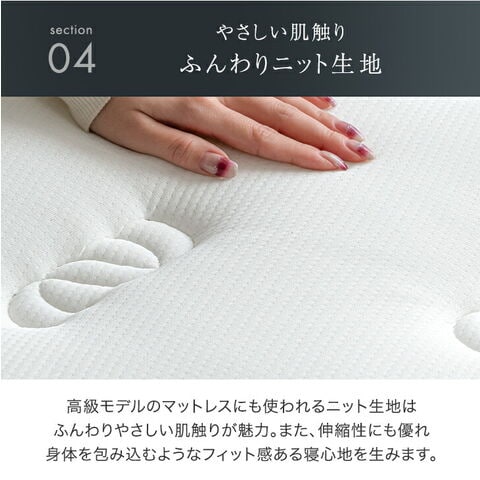 フレーム:スチール 桟木:天然木、不織布 脚:樹脂 補助脚:スチール 表面:ニット生地(ポリエステル100%) 中材: 【ピロートップ層】プロファイルウレタン(3cm/20D)、樹脂綿、不織布 高反発ウレタン(3cm/20D)、ボンネルコイル(高さ15cm)、フェルト |