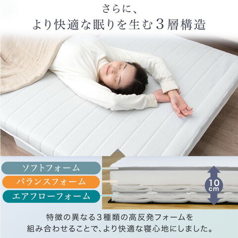 | 素材 | フレーム:スチール 桟木:天然木、不織布 脚:樹脂 補助脚:スチール 表面:ニット生地(ポリエステル100%) 中材: 【上層】高反発ウレタンフォーム(18D、70N、反発弾性45%±3%)1cm 【中層】高反発ウレタンフォーム(25D、190N、反発弾性40%±3%)4cm 【下層】高反発エアフローフォーム(25D、190N、反発弾性40%±3%)4cm |