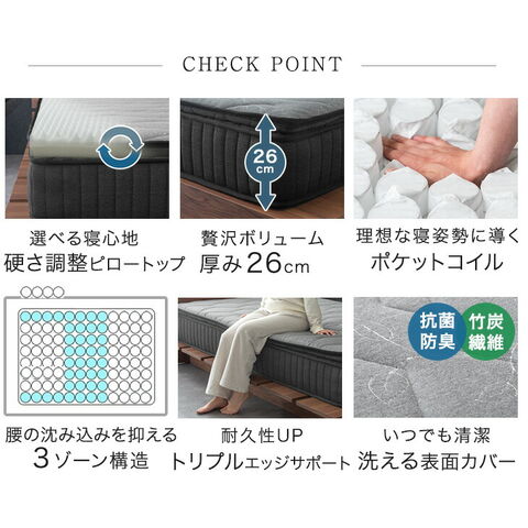 ・選べる寝心地!リバーシブルピロートップ ・贅沢ボリューム 超極厚26cm ・上質な寝心地を実現した多層構造 ・腰をサポートする3ゾーン構造 ・型崩れしにくいエッジサポート ・ハイクラスの『SWRH 72B C種』コイル使用 ・表面生地は取り外して洗濯OK! L洗濯耐久性の高い抗菌/防臭中綿フィルケア使用 L消臭効果のある竹炭繊維 ・ISO9001認定工場で生産した安心の品質 |