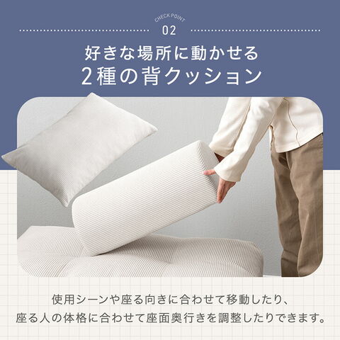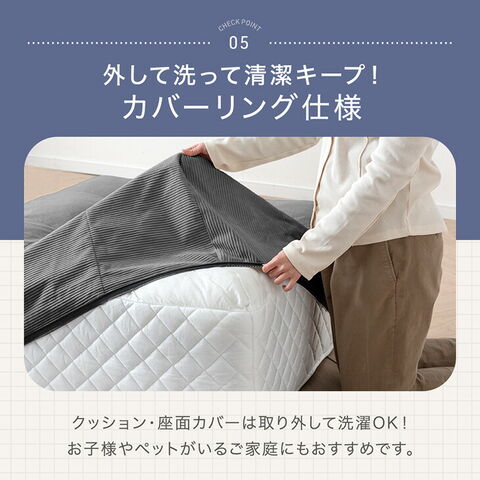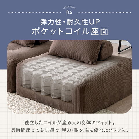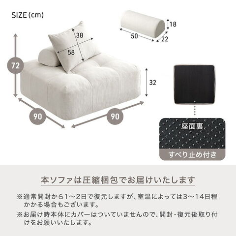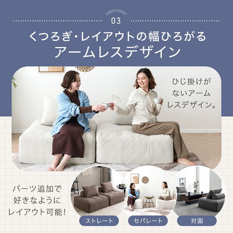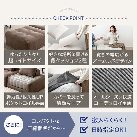 ・ワイドなくつろぎ!奥行90cmの特大座面 ・好きな場所に配置できるクッション2種 ・くつろぎの幅広がるアームレスデザイン ・弾力性&耐久性の高いポケットコイル座面 ・立ち座りしやすいエッジサポート ・カバーを洗って清潔キープ ・オールシーズン快適コーデュロイ生地 ・スピード配送&日時指定OK!コンパクト梱包 |