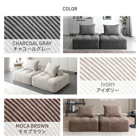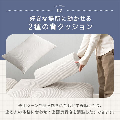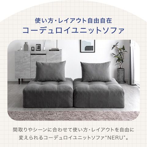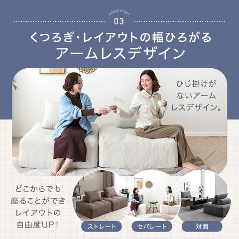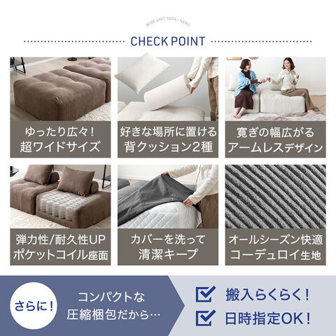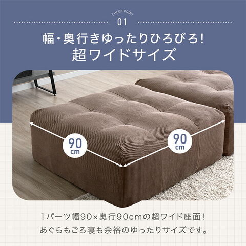 ・ワイドなくつろぎ!奥行90cmの特大座面 ・好きな場所に配置できるクッション2種 ・くつろぎの幅広がるアームレスデザイン ・弾力性&耐久性の高いポケットコイル座面 ・立ち座りしやすいエッジサポート ・カバーを洗って清潔キープ ・オールシーズン快適コーデュロイ生地 ・スピード配送&日時指定OK!コンパクト梱包 |