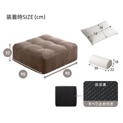 本体:幅90×奥行90×高さ32cm クッション(四角形):幅58×奥行38cm クッション(半月形):幅50×奥行22×高さ18cm |