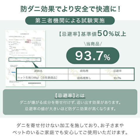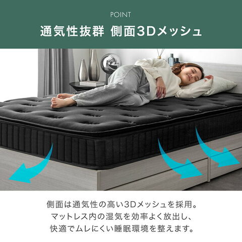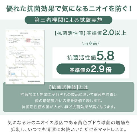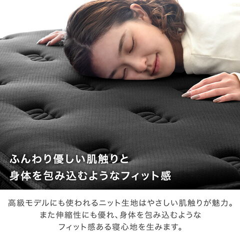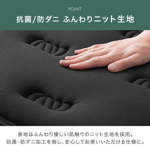 | 素材 | 【表地】ニット生地(ポリエステル100%/抗菌防ダニ加工) 【側面/裏面】メッシュ生地(ポリエステル100%) 【内部】ボンネルコイルスプリング、フェルト、不織布、20D高反発ウレタン |