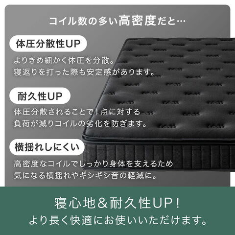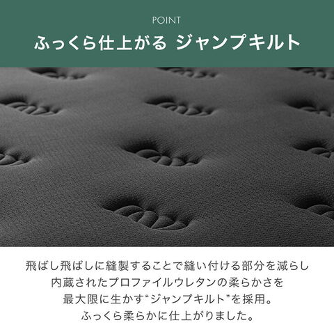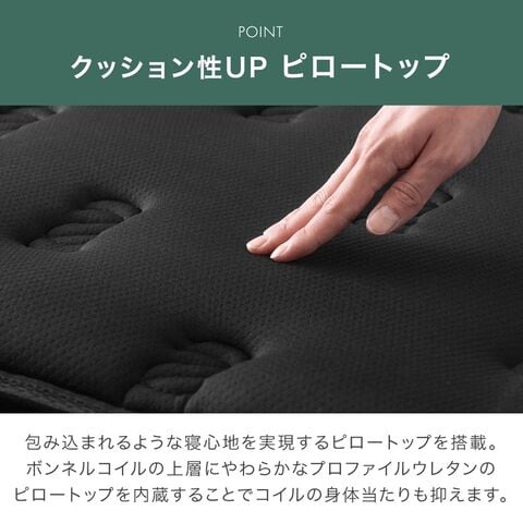 ・贅沢な寝心地 ピロートップ付マットレス ・ふっくら仕上がるジャンプキルト ・ボリュームたっぷり22cm厚 ・身体を面で支えるボンネルコイル ・やさしい肌触りのニット生地 ・清潔に使える抗菌/防ダニ加工 ・通気性に優れた側面メッシュ ・ISO9001認定工場で生産した安心の品質 |