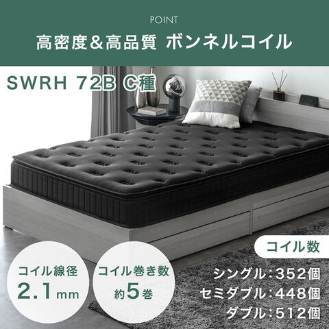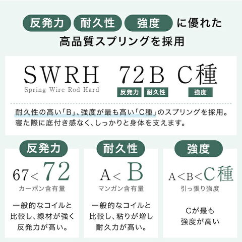 シングル:352個 セミダブル:448個 ダブル:512個 【全サイズ共通】 巻き数:5巻 線径:2.1mm 線材規格:SWRH72B C種 |