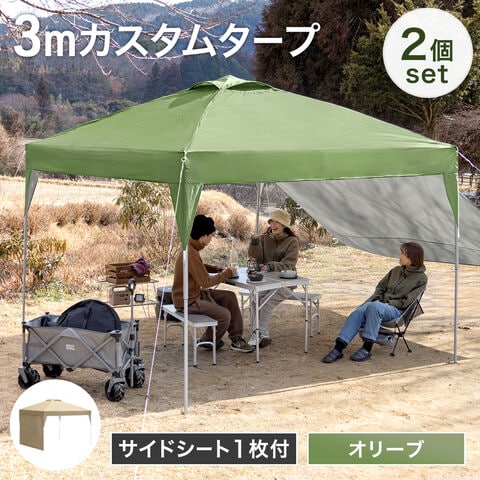 【2個セット】 【1年保証】タープテント 3m×3m サイドシート1枚付 テント 2個 セット 耐水加工 UVカット 3段階調節 (ペグ,ロープ付属,専用収納ケース付) 19010014〔オリーブ〕