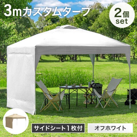 【2個セット】 【1年保証】タープテント 3m×3m サイドシート1枚付 テント 2個 セット 耐水加工 UVカット 3段階調節 (ペグ,ロープ付属,専用収納ケース付) 19010014〔オフホワイト〕
