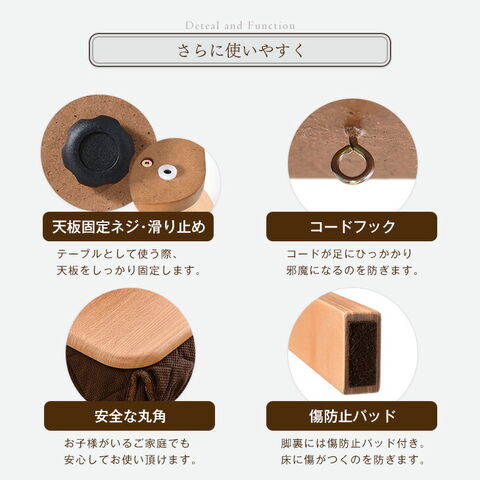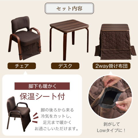 | ・デスクワークにぴったりな一人用こたつ ・脚を付け替えれば座卓にもなる2way仕様 ・こたつ本体+チェア+掛布団の3点セット ・リクライニング&3段階高さ調節可能なチェア ・チェアは脚を外せば座椅子としても使用可能 ・掛布団には収納に便利なポケット付 ・ヒーターは安心の一年保証 ・こたつ内の空気を逃がさない保温シート付 |
