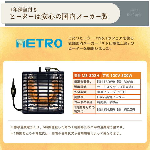 | メトロ電気工業製 石英管ヒーター(300W) 品番:MS-303H 電源:交流100V 50-60Hz ヒーター:U字形石英管ヒーター コード長さ:3m 1時間あたりの標準消費電力 ■強:約160Wh/■弱:約80Wh 1時間あたりの電気代 ■強:約4.3円/■弱:約2.2円 (※新電力料金目安単価1kWhあたり27円(税込)で計算しています。実際の電気代は、電力会社との契約内容などで変わります。) |
