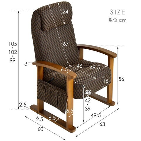 | 外寸:幅63×奥行62~101×高さ99/102/105cm 座面:幅49.5×奥行46cm 背もたれ高さ:67cm |