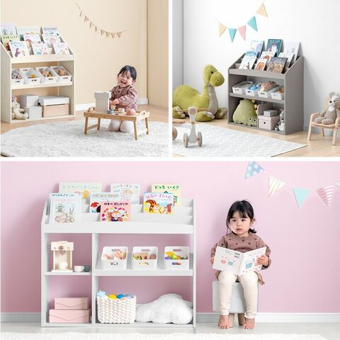 | スタッフるんるんのおすすめポイント | ・ 表紙が見やすいディスプレイ棚 ・中段は高さ&角度調整で出し入れらくらく ・下段フリースペースはおもちゃのお片付けに ・下段はホコリが入りにくい設計 ・成長しても使えるシンプルデザイン ・選べる3サイズ |