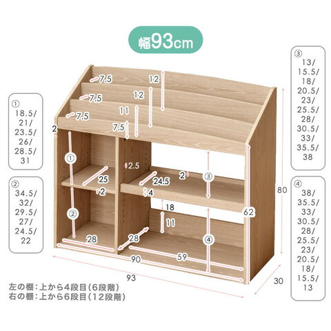 | スタッフるんるんのおすすめポイント | ・ 表紙が見やすいディスプレイ棚 ・中段は高さ&角度調整で出し入れらくらく ・下段フリースペースはおもちゃのお片付けに ・下段はホコリが入りにくい設計 ・成長しても使えるシンプルデザイン ・選べる3サイズ |