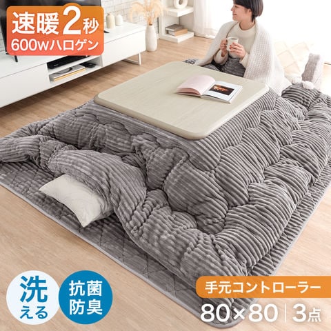 速暖2秒 600W ハロゲン こたつ コーデュロイ 布団 3点 セット 手元コントローラー 継ぎ足 高さ調節 こたつテーブル 80 正方形 テーブル 木製 21310000〔ホワイトウォッシュ【布団:アッシュグレー】〕【予約】12月20日より順次出荷予定