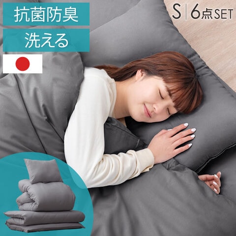 布団セット 6点セット シングル 日本製 国産 清潔 固綿増量3kg 洗える 抗菌 防臭 各カバー付 組布団 掛布団 固綿入り 掛け布団 寝具セット 敷き布団 枕 布団 敷布団 22200024 〔チャコールグレー〕【予約】1月中旬※1/20までに出荷予定