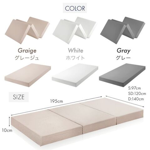 | サイズ | シングルサイズ ┗幅91×奥行195×厚み10cm 側:約420g 中材:約5kg セミダブルサイズ ┗幅120×奥行195×厚み10cm 側:約500g 中材:約6kg ダブルサイズ ┗幅140×奥行195×厚み10cm 側:約588g 中材:約7kg |
