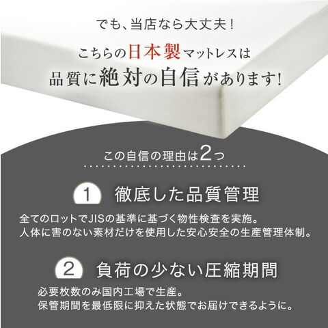 | 備考 | ※水洗いはできません。 ※開封当初の臭いが気になる場合は、風通しのよい場所で陰干しして下さい。 ※素材特性上、通気性が低く、水分がしみ込むと乾きにくいのでご注意ください。 ※ストーブ、タバコの火等の直火又は温度の高いものには近づけないでください。 ※配送は全て宅配便(1人)での玄関渡しとなります。 ※マットレスは約1~2日で復元します。気温や温度により3~14日かかる場合もあります。 ※圧縮梱包のマットレスについて、ウレタンフォームの感温性(反発弾性フォームは温度が高くなると柔らかくなり、低くなると硬さが高くなる性質)により冬場、寒いところで復元させると、復元に時間がかかります。又、部分的に復元するタイミングが異なる場合がございます。室温が18度以上の部屋に半日くらいおくと、回復がしやすくなります。 |