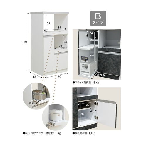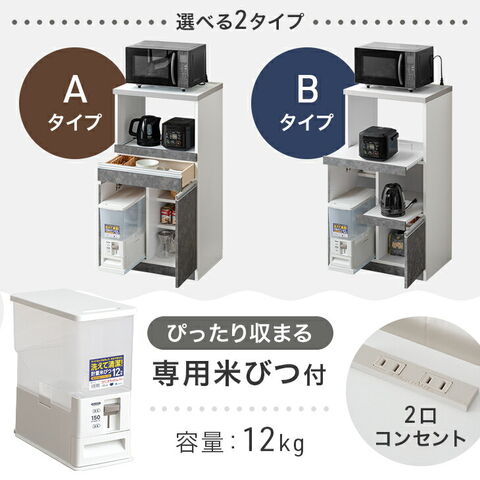 【天板】 ポリエステル化粧合板 【前板】 ホワイト:ハイグロスシート ナチュラル、モルタルブラック:強化紙 2口コンセント 消費電力:1500W 容量12kg米びつ付き |