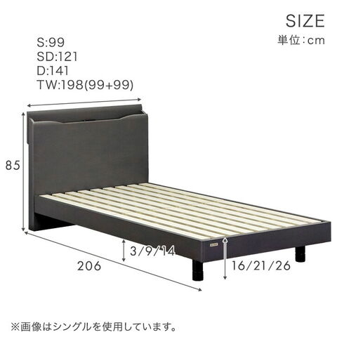 【シングル】 外寸:幅99×奥行き206×高さ85cm 【セミダブル】 外寸:幅121×奥行き206×高さ85cm 【ダブル】 外寸:幅141×奥行き206×高さ85cm 【ツイン】 外寸:幅198×奥行き206×高さ854cm 床高3段階:16/21/26cm すのこ厚:15mm |