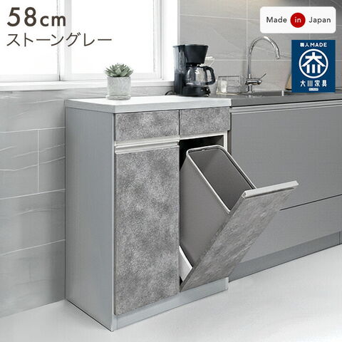 ペールカウンター 日本製 大川家具 完成品 フラップ 幅58cm ゴミ箱収納 ダストボックス レンジ台 カップボード キッチンボード レンジボード キッチンラック カウンター 北欧 23570261〔ストーングレー〕