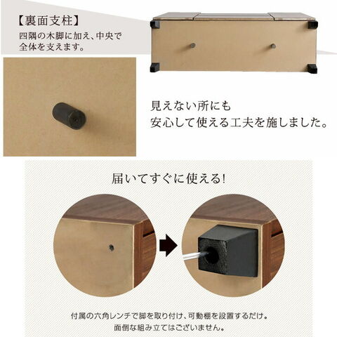 | 天板:強化シート・MDF(フェザーコア) 前面:強化シート・MDF 側面:プリント化粧合板 引き出し内部 (ウォールナット、ブルックリン、ホワイト:桐材 ) (シャビーホワイト、コークスブラック:PVCシート ) 脚:木製 手掛け:アルミ塗装仕上げ |