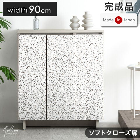 【即納】 当店限定デザイン 日本製 完成品 シューズボックス 幅90cm ソフトクローズ扉 可動棚 スリム 大容量 靴箱 ロータイプ 玄関収納 大川家具 24900116〔テラゾーホワイト〕