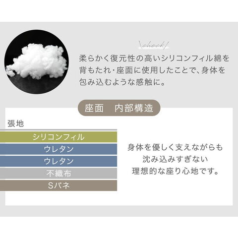 | 素材 | 張地:ポリエステル 中材:ウレタン・Sバネ フレーム:天然木 脚:プラスチック |