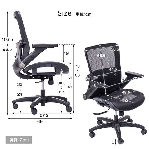 外寸:幅69×奥行69×高さ96.5~103.5cm 座面の高さ(SH):43~50cm 重量:約16.5kg 耐荷重:約110kg |