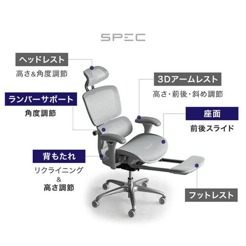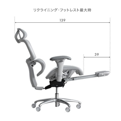 ・脚を伸ばして休憩できるフットレスト ・一息つくのに最適 最大123°リクライニング ・高さ/角度を自由に調節できるヘッドレスト ・角度調節可能なランバーサポート ・微調節できる3Dアームレスト ・体格に合わせて座面前後スライドOK ・オールメッシュでいつでも快適な座り心地 ・デスクや体型に合わせて使えるガス昇降 ・重厚感あるアルミダイキャストフレーム ・床に傷がつきにくいPUキャスター |