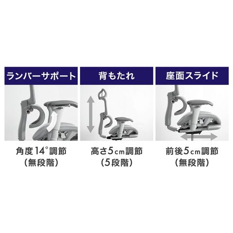 ■リクライニング 最大角度:約123° リクライニング固定:3段階(約109/115/123°) ■背もたれ 昇降:5.5cm(4段階) ■座面 前後:5cm(無段階) ■ランバーサポート 調整角度:14° ■アームレスト 昇降:8cm(無段階) 前後:3.5cm 斜め:47° ■ヘッドレスト 昇降:6cm(10段階) 調整角度:40° |