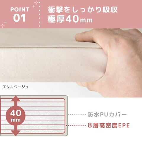 ・転んでも安心 クッション厚40mm ・思いっきり遊べる防音仕様 ・音や衝撃を吸収 高密度EPE素材を使用 ・お子様に安心してお使いいただけるノンホルムアルデヒド ・シックハウス症候群の原因物質7種をしっかり検査 ・清潔に使える抗菌カバー ・なめても安心!食品衛生法に基づく試験クリア ・拭くだけでお手入れ簡単 防水カバー ・ごみが溜まりにくいシームレス ・使い勝手の良い2つ折り ・収納時便利なジョイント式&ケース付き ・おしゃれなニュアンスカラー ・床暖房対応 |