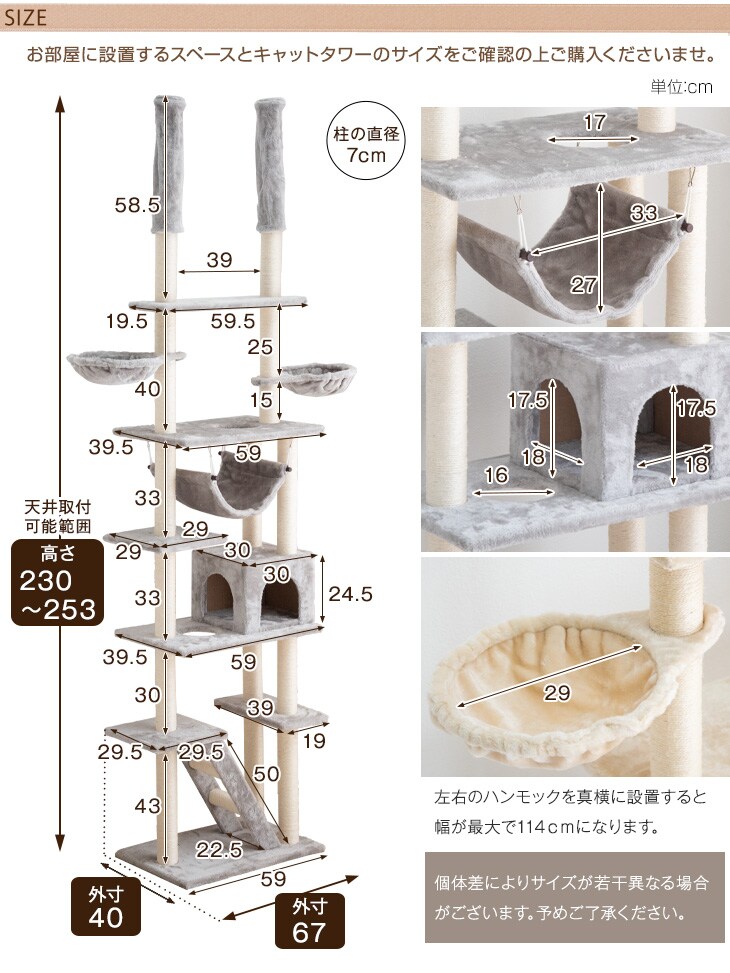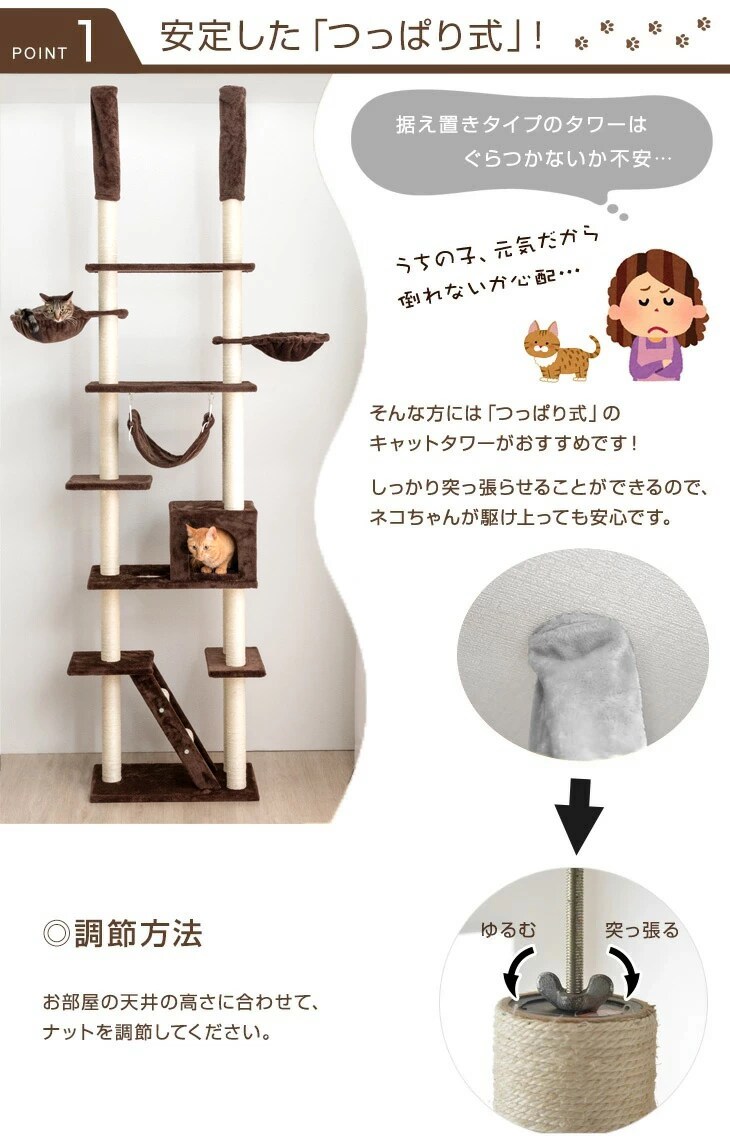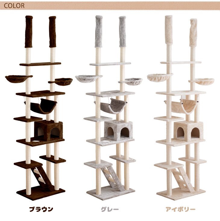 【即納】 キャットタワー 突っ張り タイプ 幅60×奥行40.5×高さ230~253cm 【バスケット/ハンモック/爪とぎ/ベッド】32000003〔アイボリー〕
