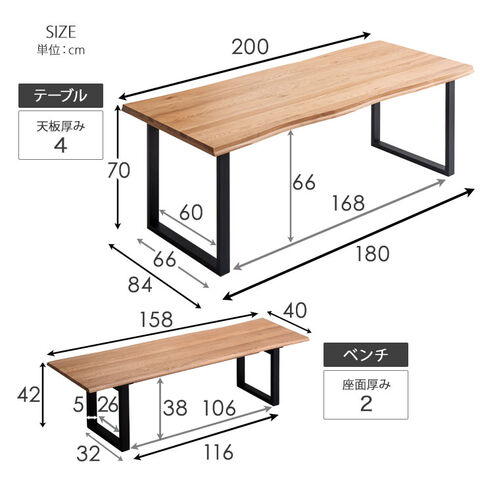 | 【テーブル】幅200×奥行85×高さ70cm 【チェア】幅49×奥行60×高さ72cm/座面高42cm 【ベンチ】幅158×奥行40×高さ42cm |
